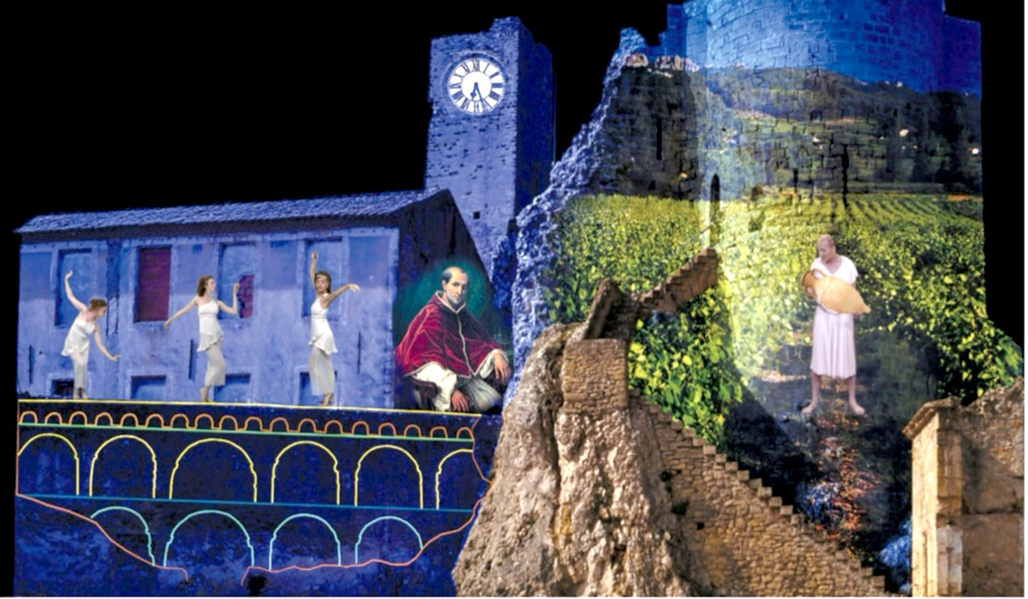 Saynètes théâtrales, projection sur bouteille de vin géante, récital lyrique dans les régions, villages, et domaines viticoles.